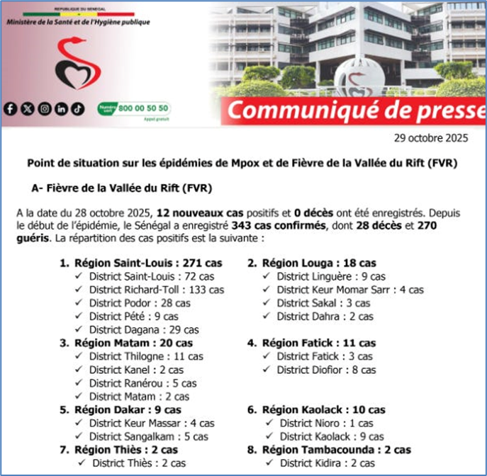 Seit dem Update vom 28.10.2025 hat sich die Zahl der bestätigten RVF-Fälle von 331 auf 343 erhöht. Die Zahl der Todesfälle ist mit 28 gleichgeblieben. Die Fälle werden aus den folgenden Regionen berichtet: Saint-Louis (271), Matam (20), Louga (18), Fatick (11), Dakar (9), Kaolack (10), Thies (2) und Tambacounda (1). Von den 331 bestätigten Fällen sind 270 Patienten genesen.