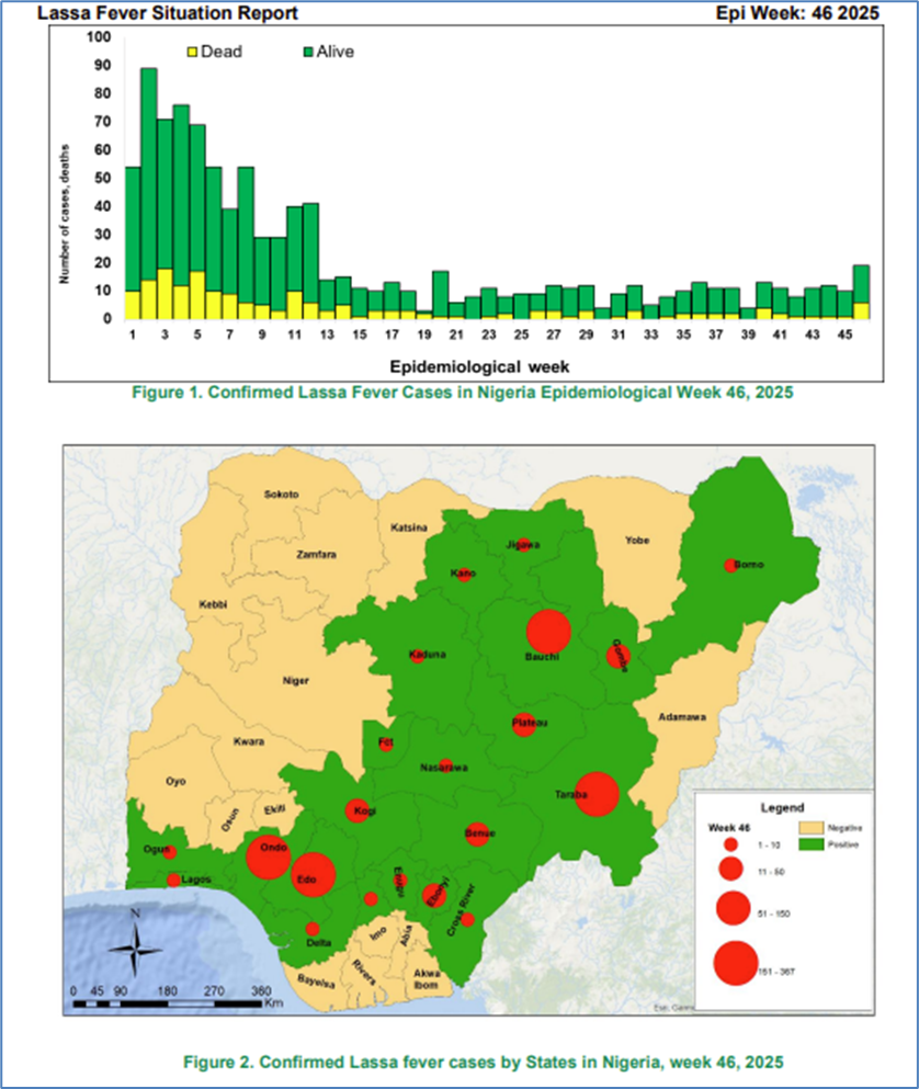 Zwischen dem 1. Januar und dem 16. November 2025 wurden in Nigeria insgesamt 8.679 Lassa-Fieber-Verdachtsfälle gemeldet, davon wurden 995 Fälle bestätigt, 184 Todesfälle wurden registriert.