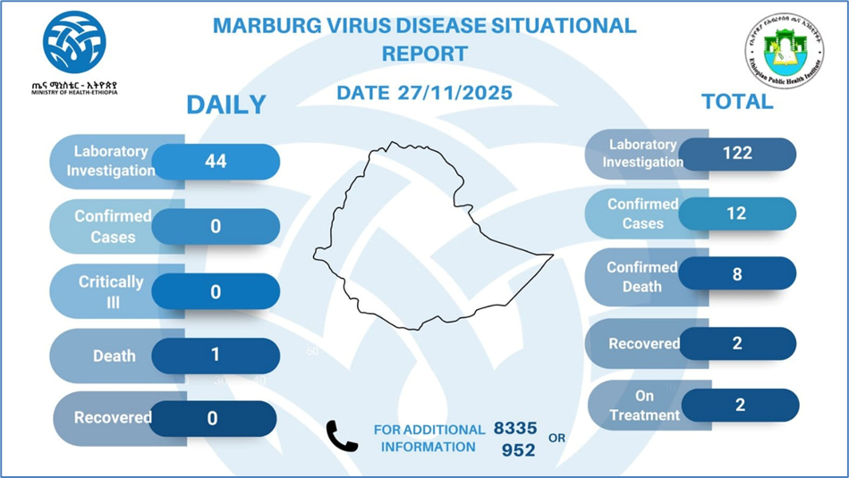 Im laufenden Ausbruch der Marburg-Virus-Krankheit (MVD) in Äthiopien meldete das Gesundheitsministerium zwei weitere MVD-Fälle und drei Todesfälle. Damit steigt die Gesamtzahl der bestätigten Fälle bis zum 27. November auf zwölf und die der Todesfälle auf acht. Zwei Patienten sind genesen, zwei befinden sich derzeit in Behandlung. Religiöse Führer, Lehrer und Gemeindemitglieder wurden aufgerufen, ihrer Verantwortung nachzukommen und die Gläubigen über die Präventionsmaßnahmen gegen die Ausbreitung der Krankheit aufzuklären.