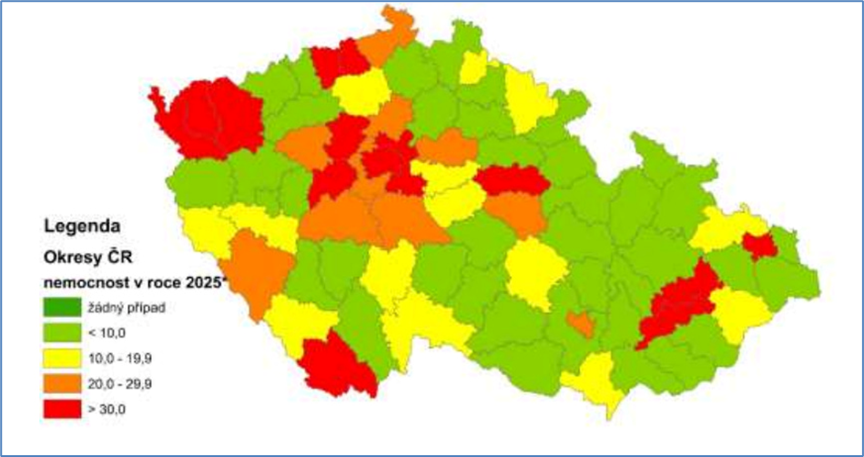 Seit dem Update vom 22.11.2025 haben sich die Fallzahlen im laufenden Ausbruch von Hepatitis A in Tschechien von 2.597 auf 3.049 erhöht. Die Zahl der Todesfälle ist von 29 auf 34 angestiegen. Die Zahl der in den letzten Wochen gemeldeten Fälle ist seit etwa der 45. Kalenderwoche rückläufig. Die meisten Hepatitis-A-Fälle im Jahr 2025 wurden aus der Hauptstadt Prag (1303 Fälle), der Region Mittelböhmen (461 Fälle) und der Region Mährisch-Schlesien (243 Fälle) gemeldet. Die gemeldeten Hepatitis-A-Fälle im Jahr 2025 übersteigen die durchschnittlichen und maximalen Fallzahlen der Jahre 2018 bis 2024 deutlich. Fälle wurden in allen Altersgruppen registriert, von Kleinkindern bis zu Senioren. Die meisten Hepatitis-A-Fälle im Jahr 2025 wurden bei Personen im Alter von 35 bis 39 Jahren gemeldet, gefolgt von den Altersgruppen 40–44 Jahre, 30–34 Jahre und 45–49 Jahre. Bei Kindern wurden die meisten Fälle in der Altersgruppe der 5- bis 9-Jährigen registriert. Hepatitis A wurde bei 14 Kindern unter einem Jahr berichtet. Von den insgesamt 3049 im Jahr 2025 gemeldeten Fällen wurden 2350 Personen (77,1 %) stationär aufgenommen.