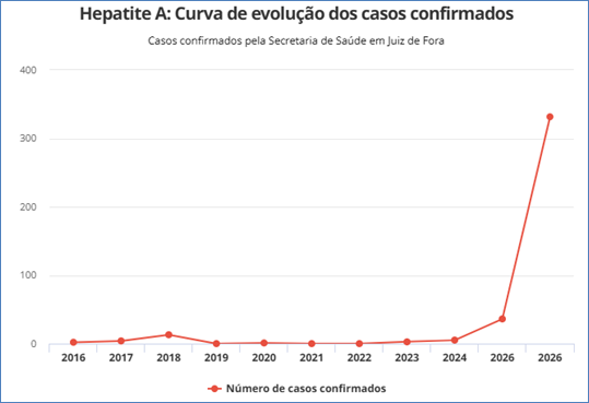 In der Stadt Juiz de Fora, BS Minas Gerais, wurden zwischen Januar und März 2026 insgesamt 331 Fälle von Hepatitis A bestätigt. Diese Zahl übersteigt die Gesamtzahl der in der Stadt in den letzten zehn Jahren (2016–2025) registrierten Fälle. Die Stadtteile Centro, São Mateus und Cacatinha weisen mit 28, 27 bzw. 24 bestätigten Fällen die höchsten Fallzahlen auf.
